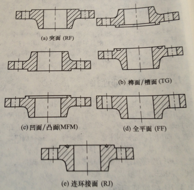 全平面法兰一般用于低压铸铁、铸钢或非金属阀门中。突面法兰在中低压情况下能达到很好的密封效果,故在客户无特殊要求时中低压阀门大多采用突面法兰。榫槽式法兰是将平垫片安装在封闭槽中,这种结构在密封面上,可产生很高的密封比压,通常远远超过垫片材料的屈服点,从而保证了可靠的密封性。其缺点是长期使用后,阀门部件维修或更换时,垫片难以从密封槽中取出,如果硬性取出,往往会将密封槽损坏,所以这种法兰并不是广泛使用的法兰类型,它的用途也很有限。凹凸式法兰是将平垫片安装在凹面法兰的密封面内,与榫槽式密封结构相比,其易于拆卸,其缺点是垫片容易与介质接触,使用在高压下易被介质冲刷、变形,无法起到良好的密封效果,设计、制造时可根据实际需要适当地加入内、外环、及内、外包边,以提高其密封效果。环连接面法兰是在两个带有环型凹槽的突面法兰中放入一个环型软技术环垫片,垫片会有轻微的变形以起到密封作用,它广泛用于高压和有毒流体管道。常用法兰密封面类型及代号如图1-8所示。
