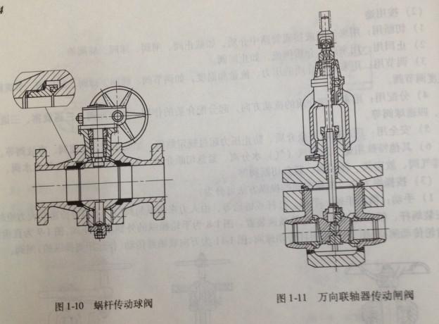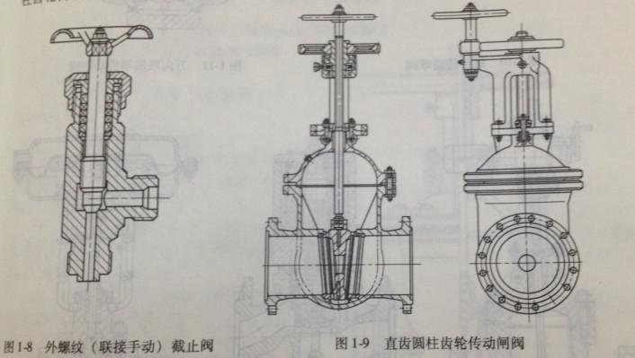 1)手动:借助手轮、手柄、杠杆或链轮等,由人为来操纵的阀门。当需要传递较大力矩时,可安装蜗杆、锥齿轮、圆柱齿轮等减速装置。图1-8为手轮操纵的外螺纹截止阀,图1-9为直齿圆柱齿轮传动闸阀,图1-10为蜗杆传动球阀,图1-11为万向联轴器传动(作远距离操纵的)闸阀。