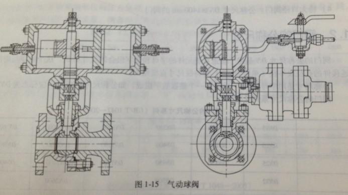 3)液动和拨动:借助液体(水、油等液体介质)或空气来操纵的阀门。图1-14为气动薄膜调节阀,图1-15为气动球阀。